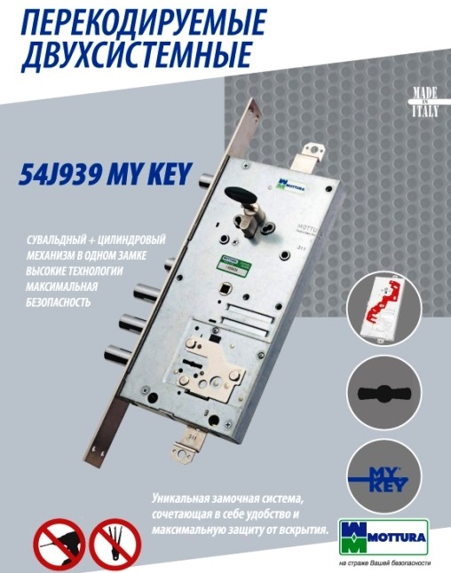- комплектация инновационной системой замка My Key, которая серьезно затрудняет вскрытие замка с помощью отмычек благодаря подвижным сферам на ключе и внутренним пинам;